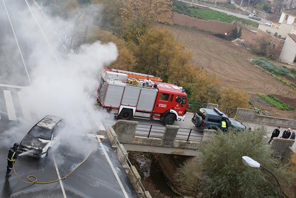 Una dotación de bomberos acudió para sofocar el incendio del vehículo que probablemente pudo estar provocado por alguna chispa.
