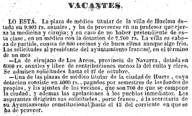 Corria el año 1844, en concreto el Domingo 6 de Octubre y el "Boletin de Medicina, Cirujia y Farmacia" informaba de vacantes a cubrir, entre ellas ésta de médico-cirujano para Los Arcos.
